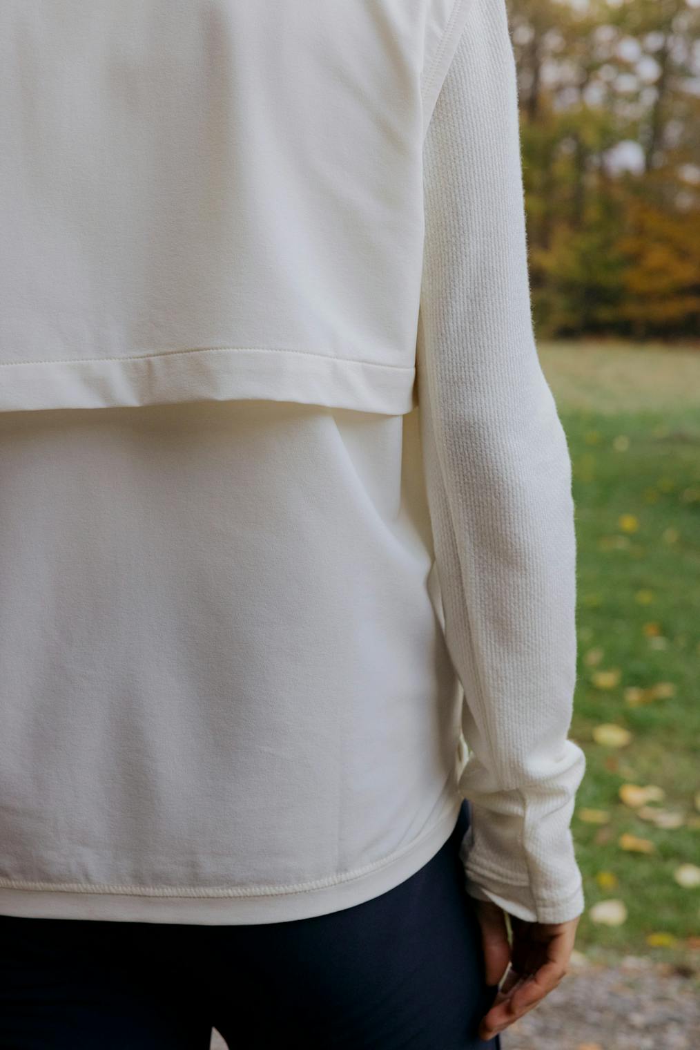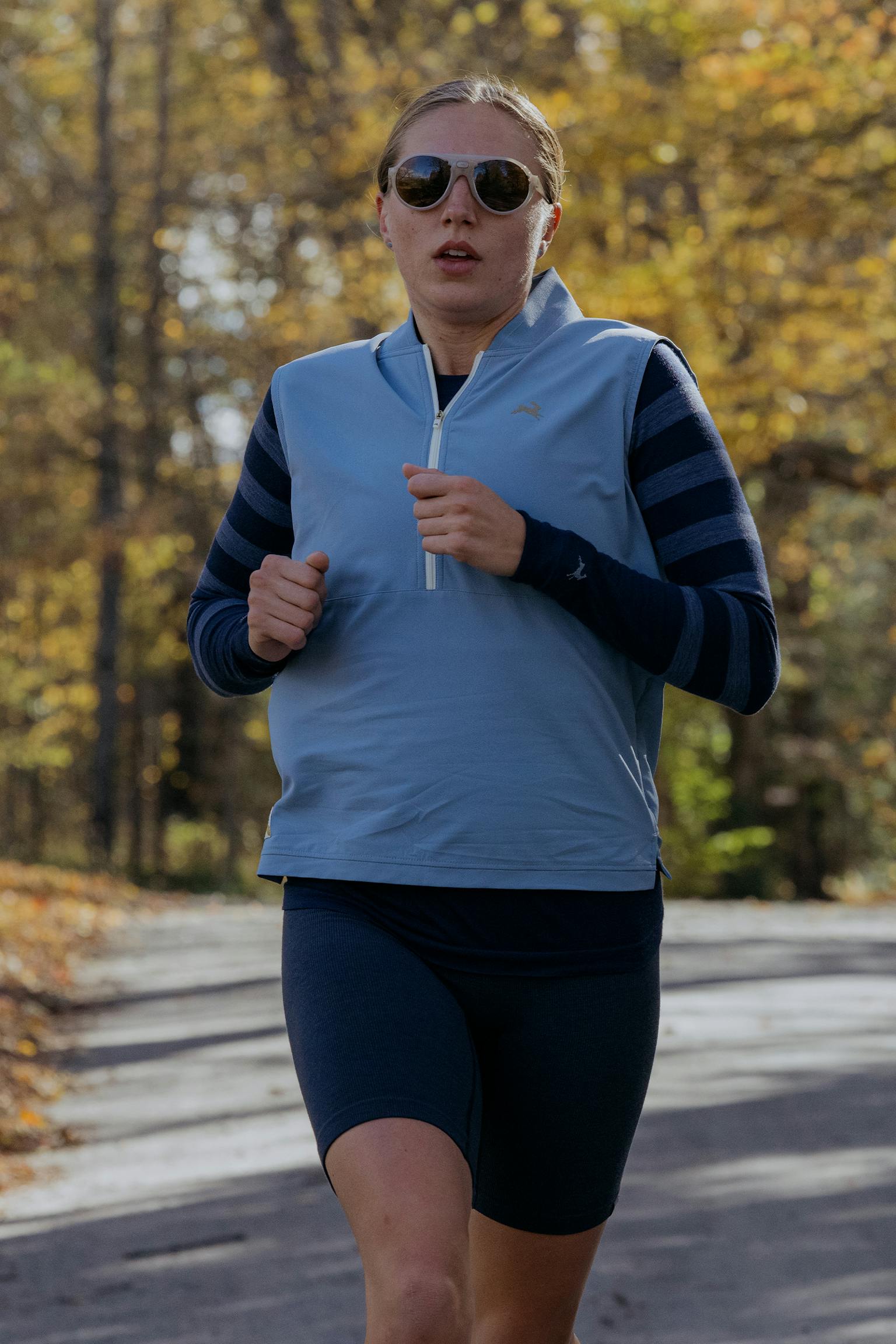 - A sleeveless, half zip silhouette with a ribbed stand collar