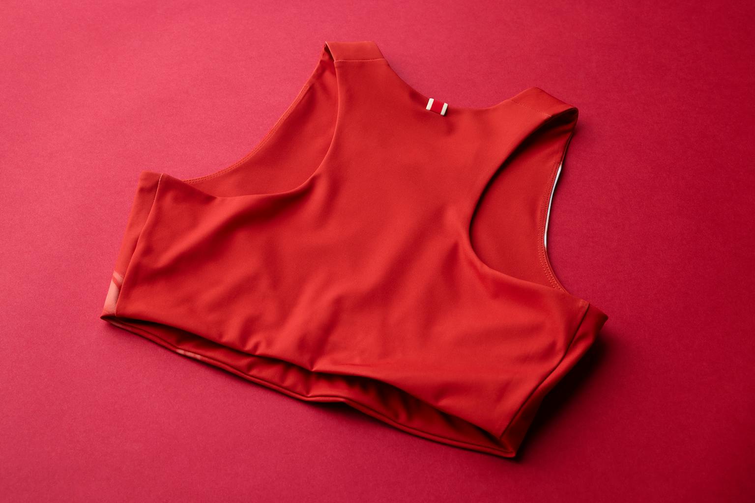 In a racerback silhouette with a modest scoop neckline, the top provides coverage at the bust, while the hemline hits above the belly button for a cropped cut. It’s a sleek style designed for speed.