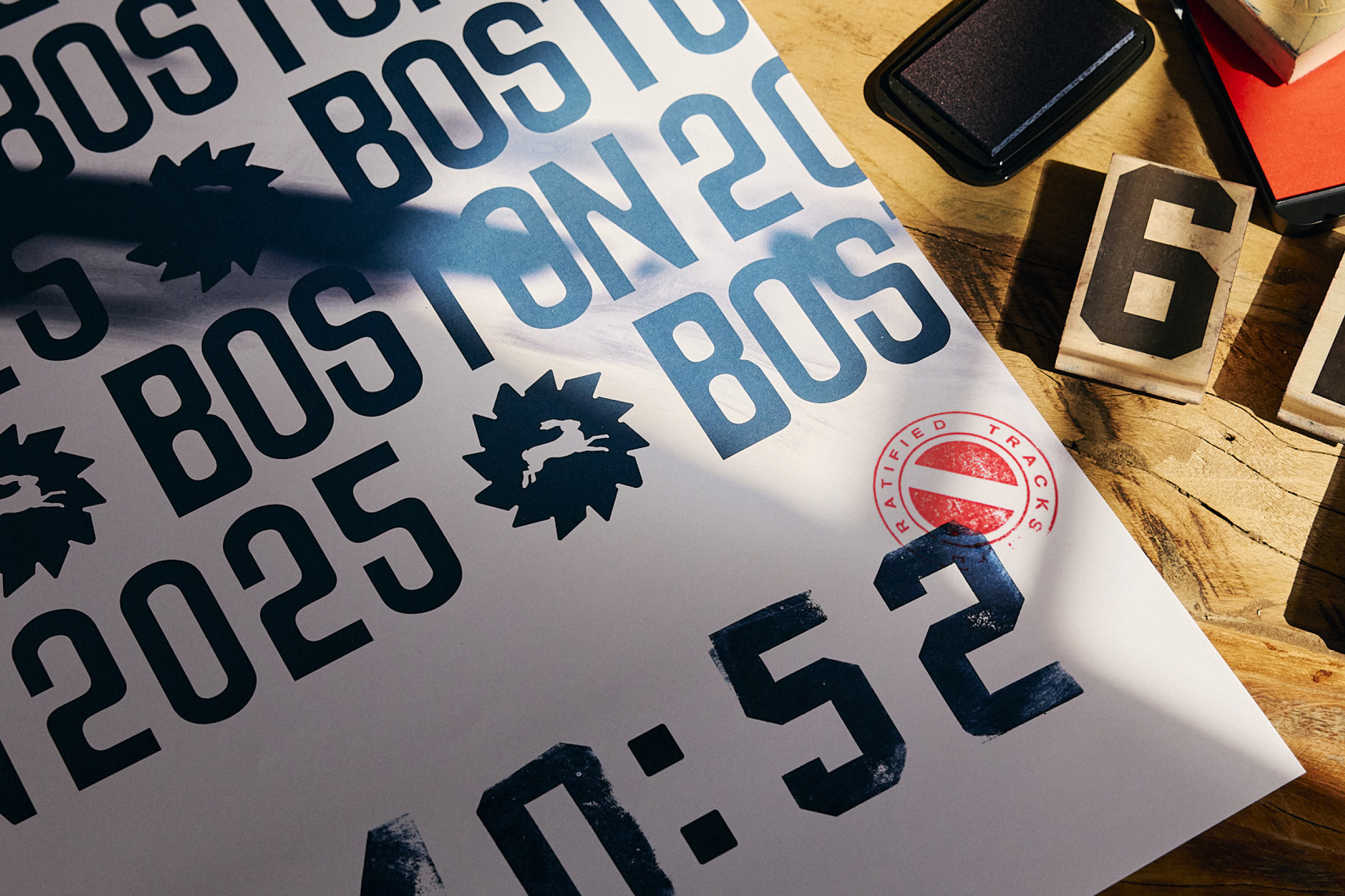 The hand-stamped marathon poster is a Tracksmith tradition. Over the past decade, at renowned races, you often find us somewhere beyond the finish line, surrounded by runners with medals, tired yet triumphant as they pick up their commemorative keepsake, adorned with graphics that represent race day, and have it hand-stamped with their finish time. While we’ll continue this custom at future marathons, the posters are now available online for Tokyo, Boston, and London ‘25. We’ll even still have them hand-stamped and Tracksmith ratified.