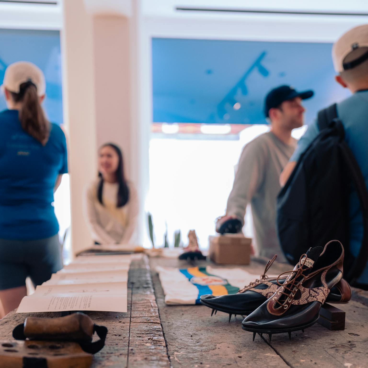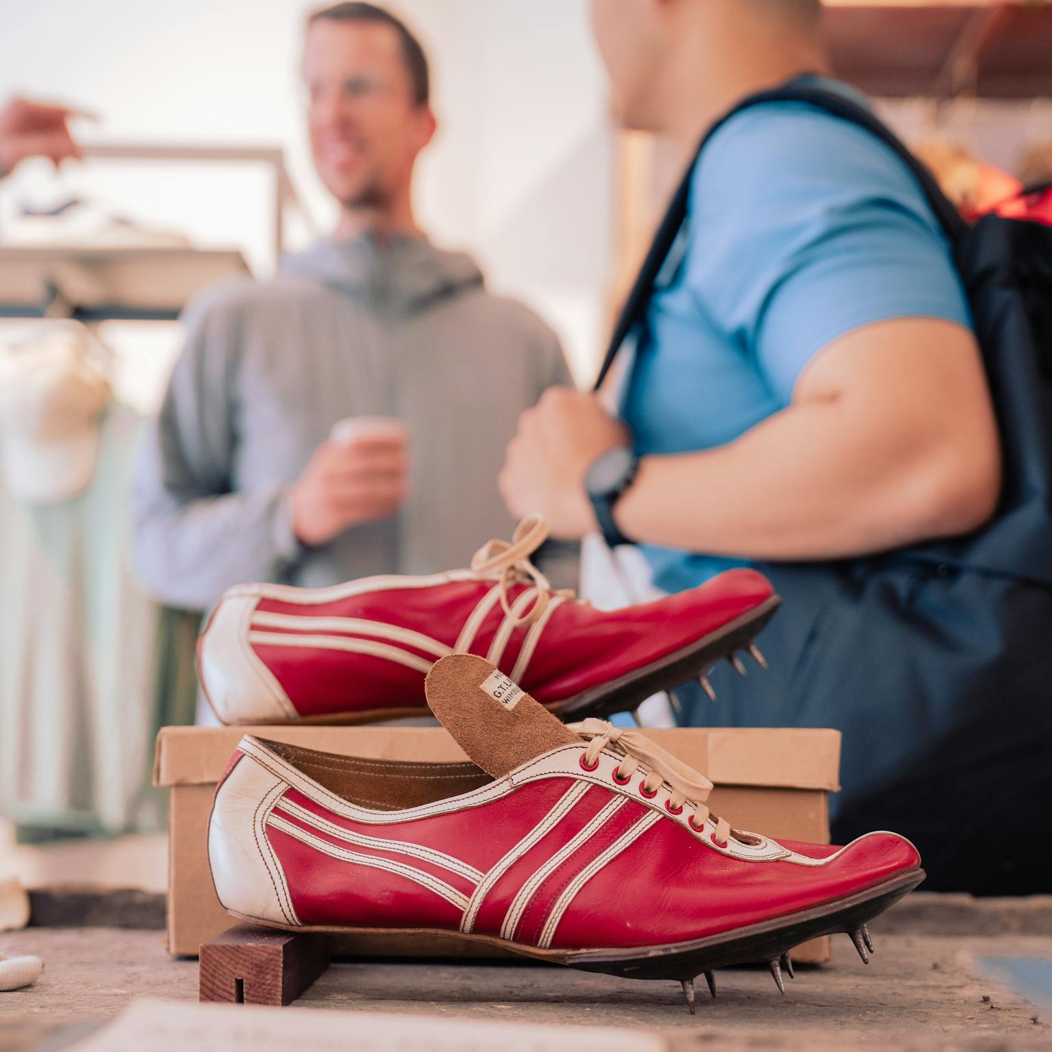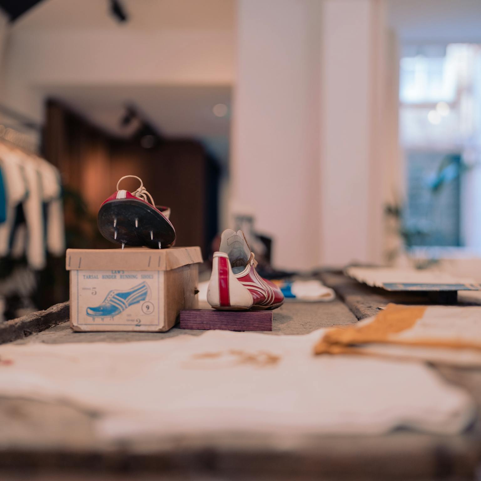 In Northamptonshire, one of the hubs of shoemaking, Law enlisted the help of locals for shoe production. Mr. Stafford handled clicking and solving the leather, Mrs. Hillyard sewed the leather panels together, and Mr. Tompkins closed the shoes on the last. Soles and studs were fixed in the Wimbledon shop, which remained operational until the early 1970s. Running spikes had ceased production before then. Although it's uncertain if Mr. Tomkins was directly involved in the production of Banister’s spikes, King believes that such details bring a company to life, making it more than just a label and a shoe.