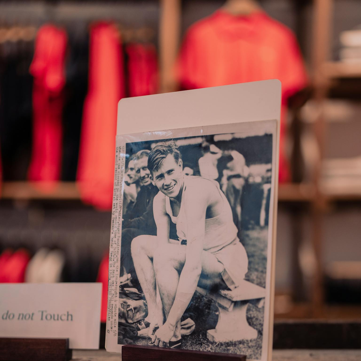 The accompanying plain white shorts, bearing the marks of wear and stains, resemble the ones Bannister wore. Designed by Geoff Dyson for Gymphlex in the 1950s, these shorts reflect Dynson’s status as a pioneering athletics coach and author of the influential book, “Mechanics of Athletics,” which served as a coaching ‘bible’ of the time and remained in print until the 1970s.