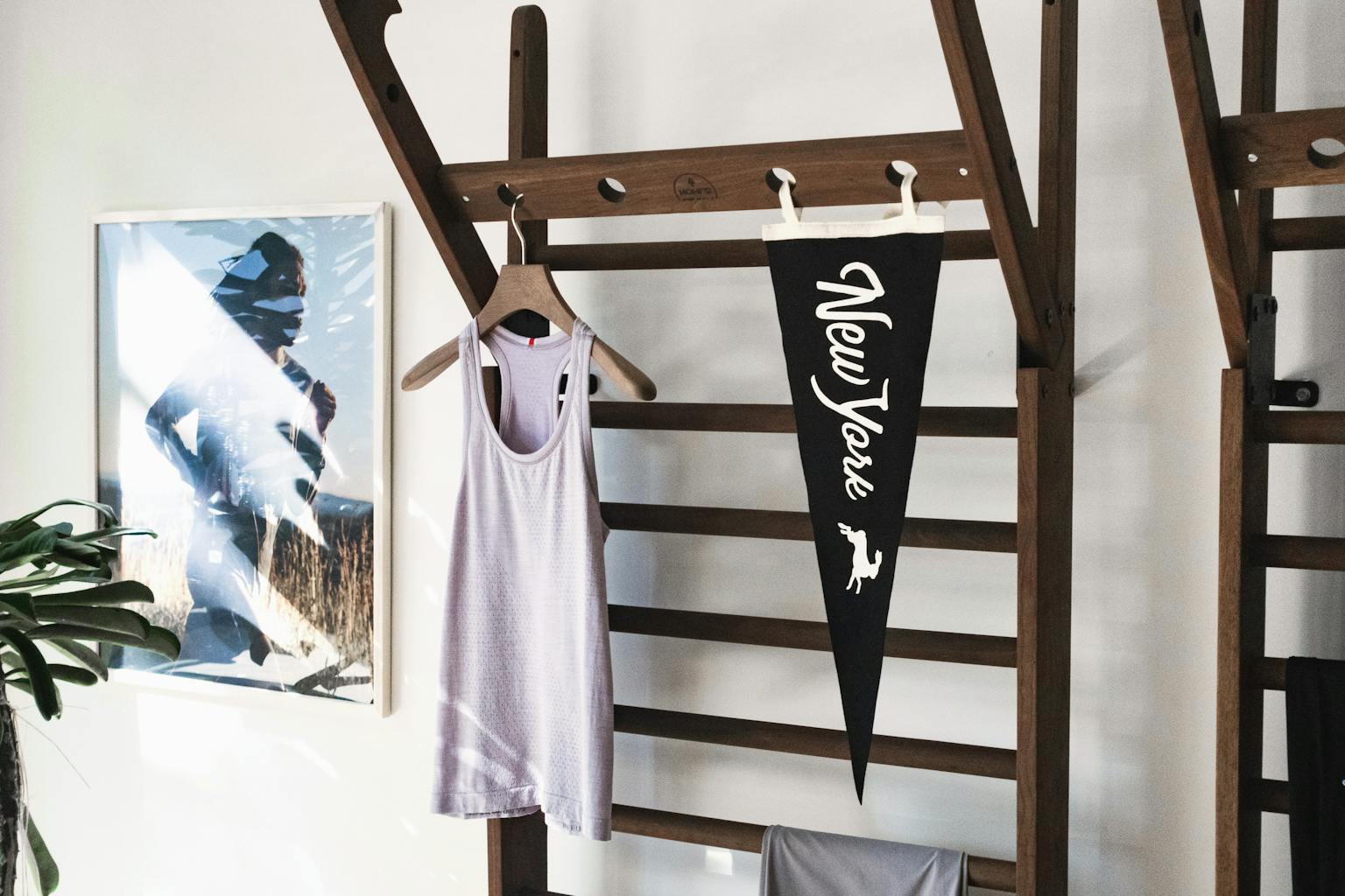 “I’ve always admired the aesthetic that Tracksmith’s Creative Director Rafa Oliveira has brought to the brand – it’s the perfect balance of the classic northeastern American heritage with a cleansing modern approach,” says Bailey-Babenzien. “I adopted this direction with the interior design, combining classic materials that might be found in athletics clubs, such as  herringbone floors, walnut cabinetry and brass hardware. We juxtaposed this with graphic elements such as a terrazzo running track into the floor with brass inlays, solid walnut gym bars and the Tracksmith signature sash across the ceiling in navy. We made the skylight as big as physically possible & added plants and trees to give the sense of letting the outdoors in. We designed a space where friends can feel at home.”