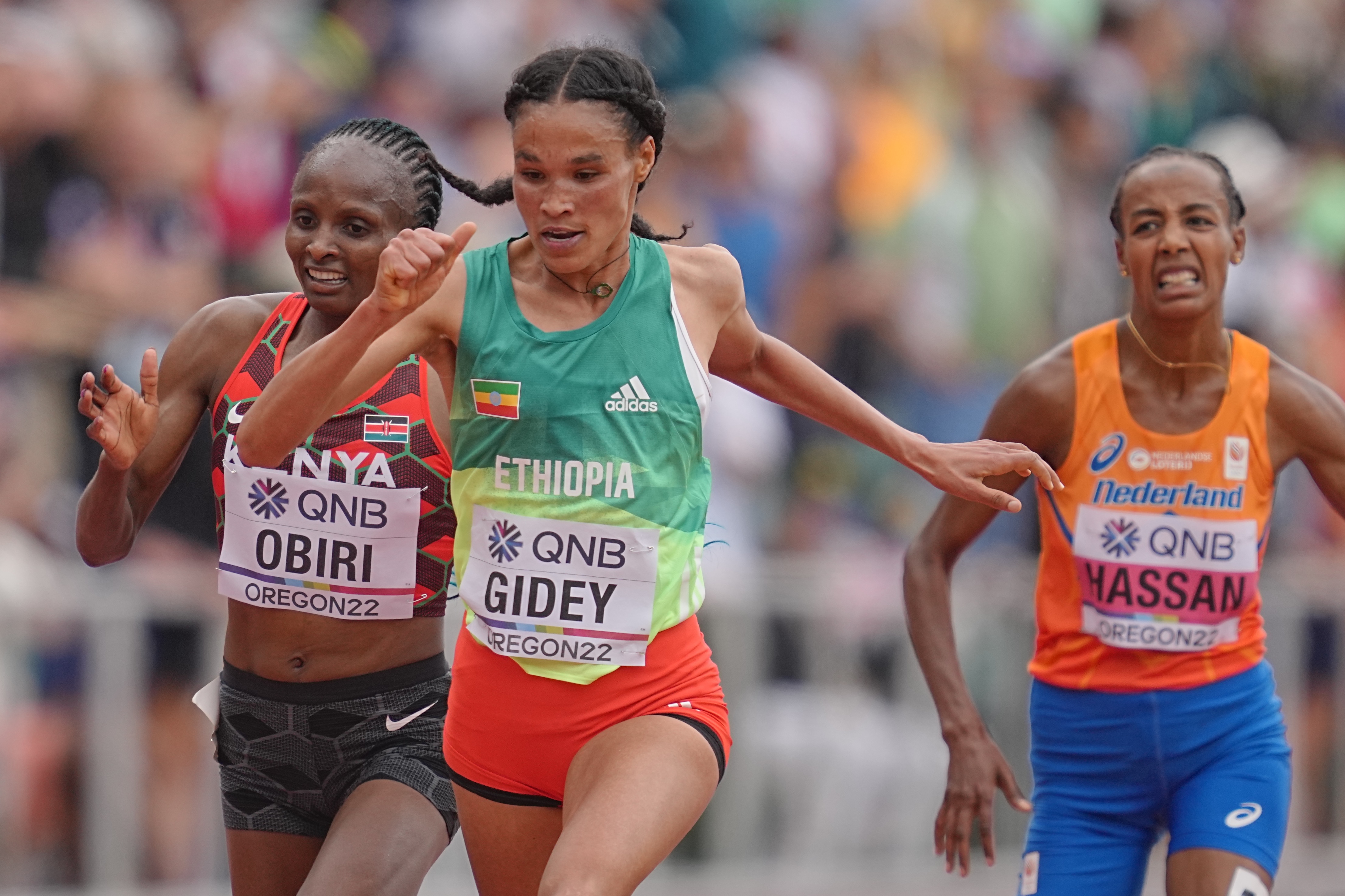 The longest race on the track came down to one second. In a dramatic homestretch sprint, Letesenbet Gidey of Ethiopia ran 30:09.94 to edge Kenyans Hellen Obiri (30:10.02) and Margaret Chelimo Kipkemboi (30:10.07) to win her first World Championship title in the 10,000m.