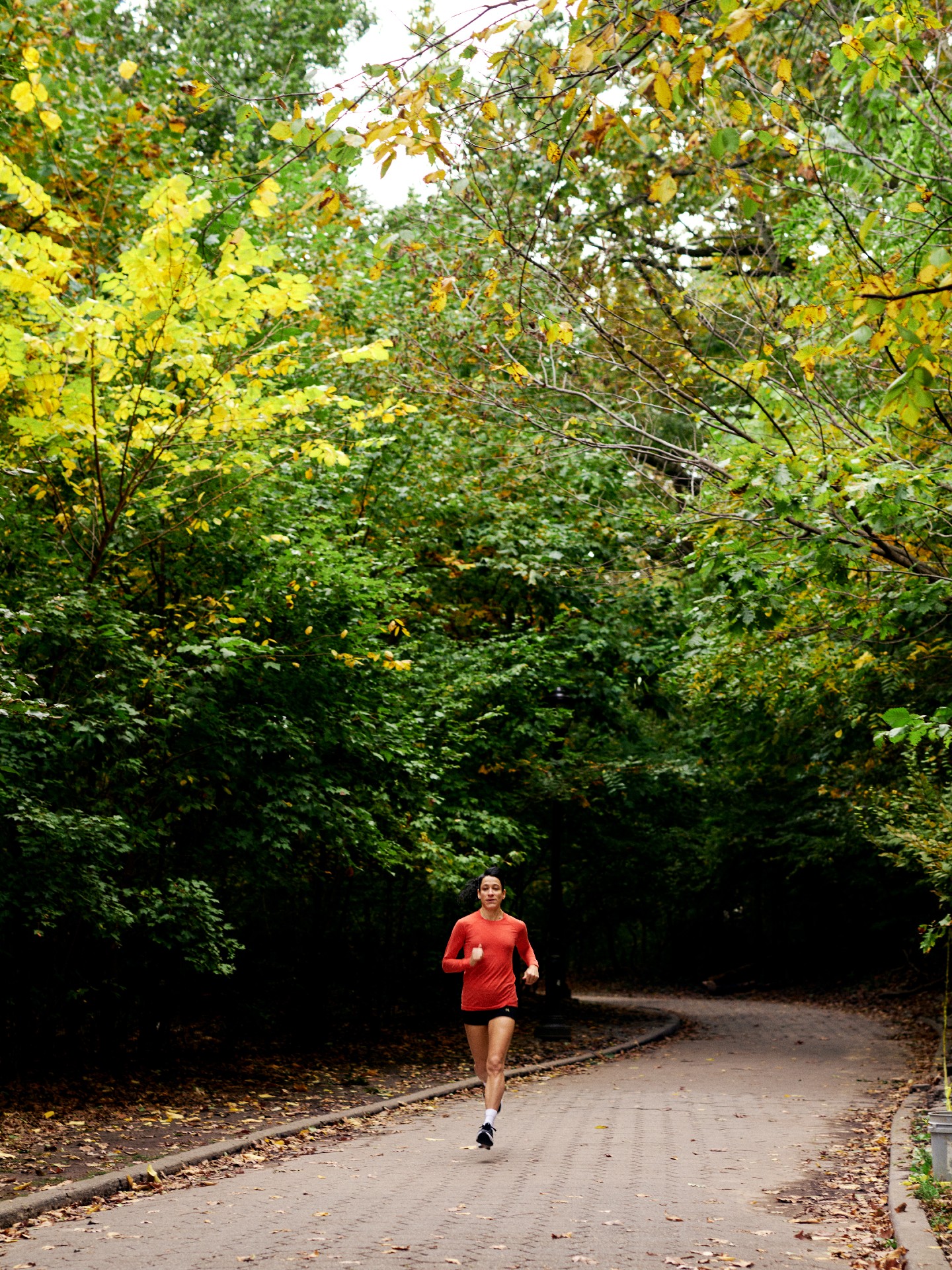 In high school, Ortiz was a soccer player. She was performing a routine drill at practice when her teammate kicked the ball at the exact same time as her, the impact of the collision breaking Ortiz’s fibula and tibia. Her teammate never even touched her directly. They just kicked the ball with simultaneous force. “The other girl was perfectly fine! I guess I just had weak bones,” she says. A fractured leg took her out of an entire season; she wore a cast all the way to her hip for three months. “After that, I was like, ‘Maybe I should try a non contact sport?’” That’s when she became a runner. Senior year, she tried out cross country and started to race. Ortiz loved the team aspect, but when she got to NYU, she didn’t join the cross country team; redirecting her performance energy into music. “Nobody goes there for sports anyway. So I just ran for fun.”