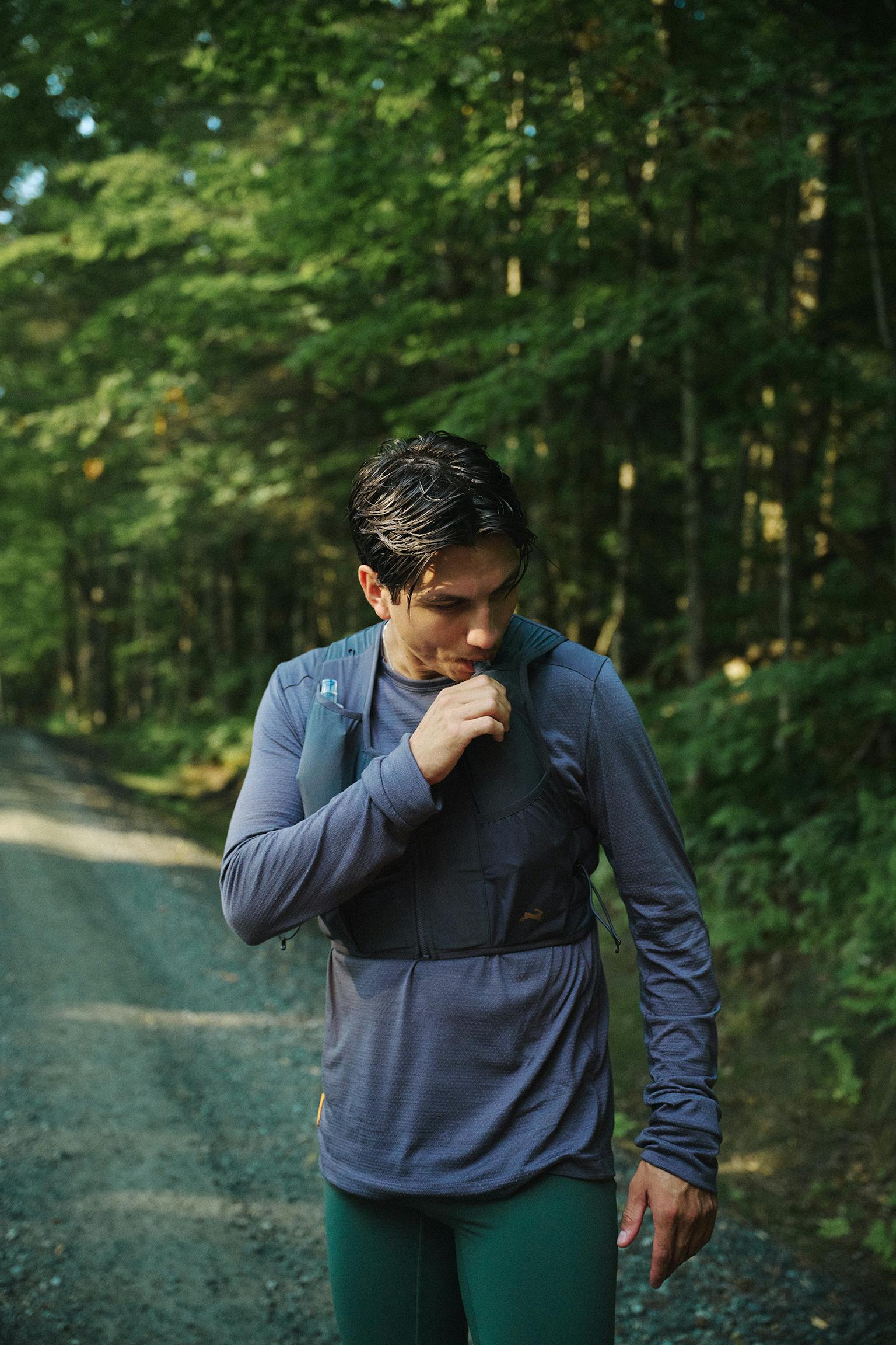 The Eastern Hemlock, the Cedar, the White Oak. There are certain tree species in New England that have held their ground for centuries, becoming organic emblems of strength, symbols of growth from the ground up. As runners, we resonate with that unending aspiration (and instinct) to keep going onward, and so we arm ourselves to do so. Meet the Overland Hydration Vest. Designed with the same intentional expertise as our apparel, it features adjustable side cords and a full front zip for a tailored fit. Ten pockets and two 500mL flasks equip you for the trail runs that take you farthest.