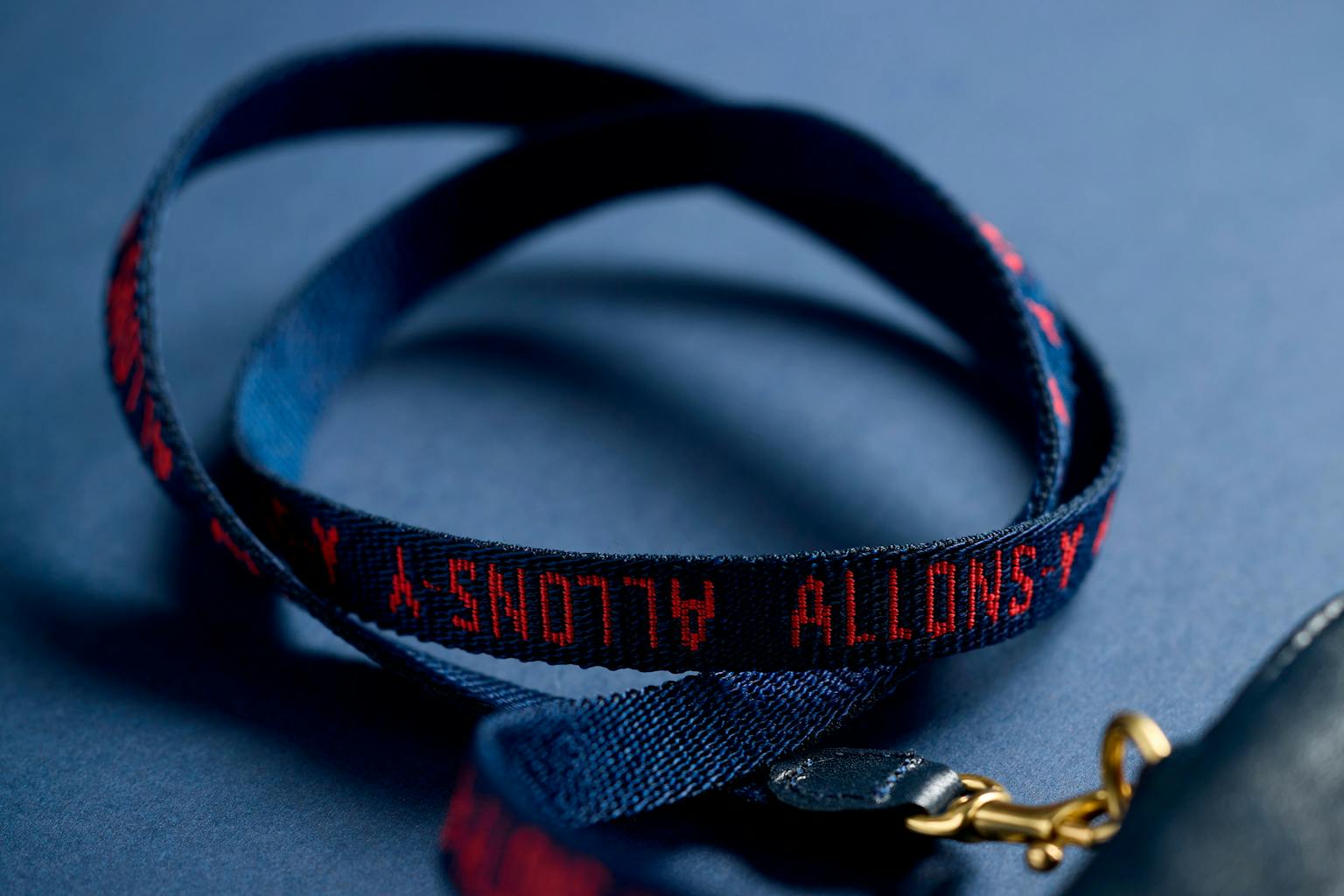 The Poche Sportif is finished with a chambray lining on the interior, gold hardware, and a detachable crossbody strap that features the French phrase “Allons-y” accented in orange.