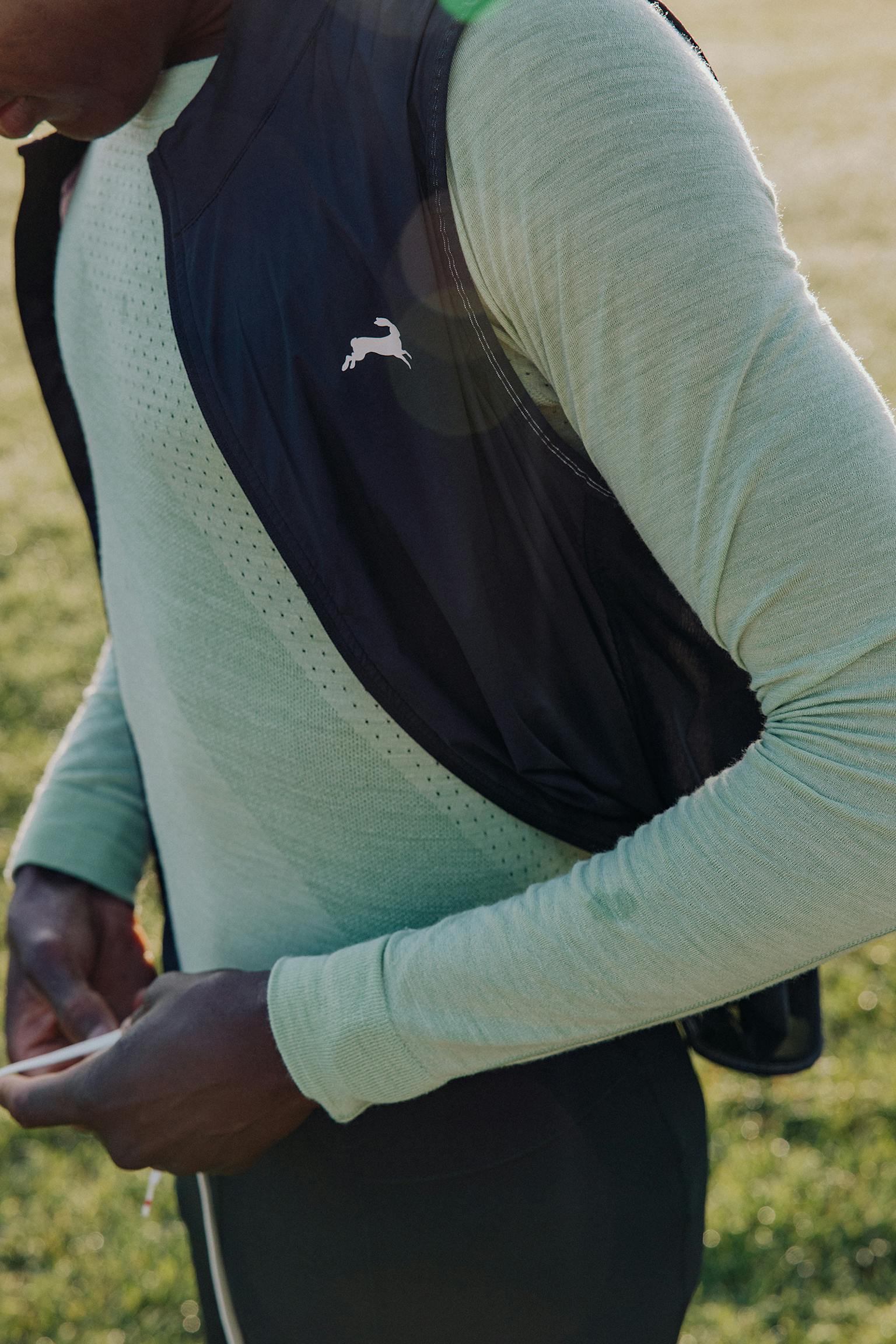 The Merino mesh is more open around your core, with a closed knit on the sleeves to keep your arms warm. Perforation around the chest, back, and underarms allows for air flow without impeding on the fabric’s ability to maintain an ideal temperature.