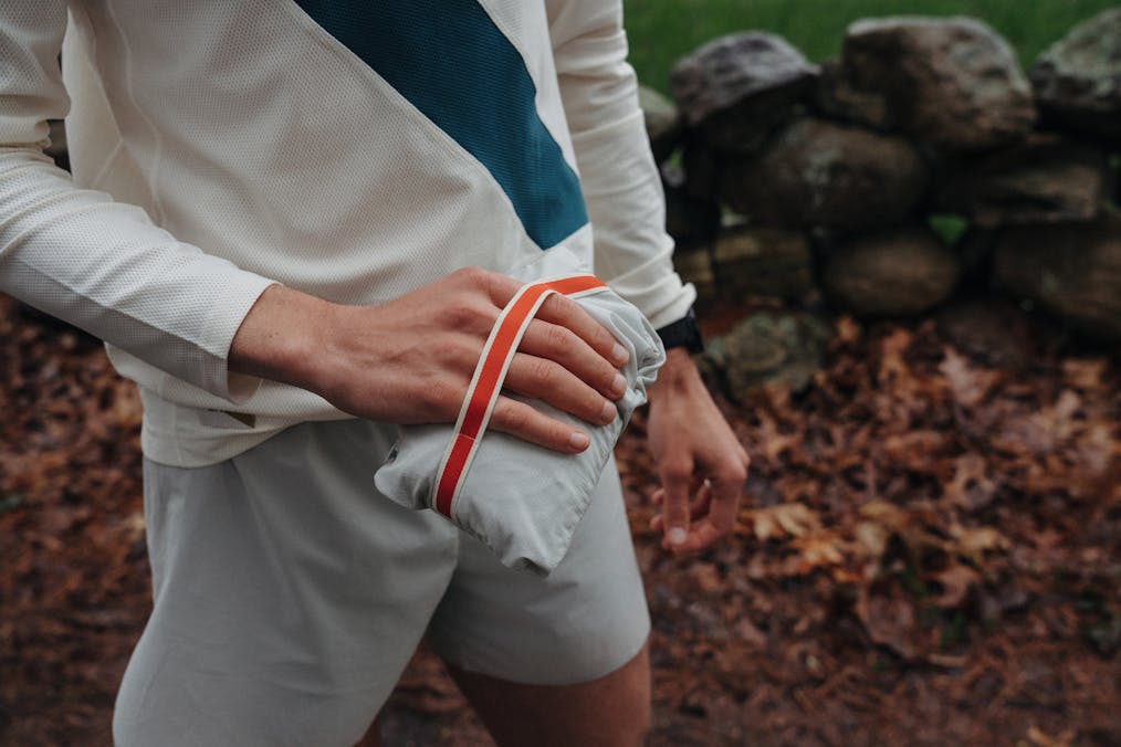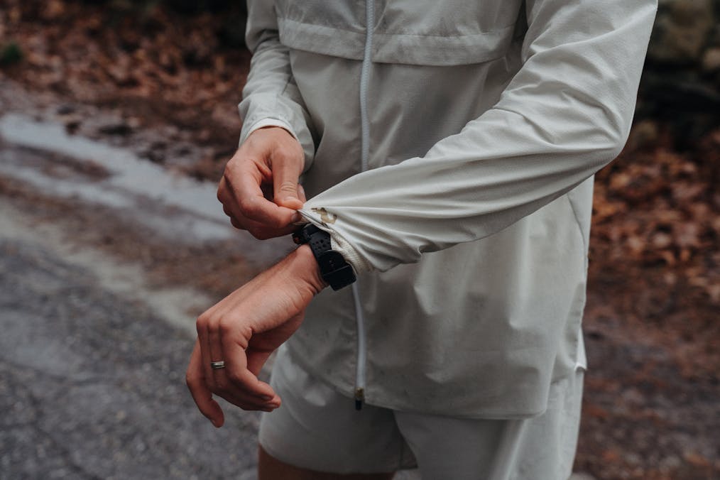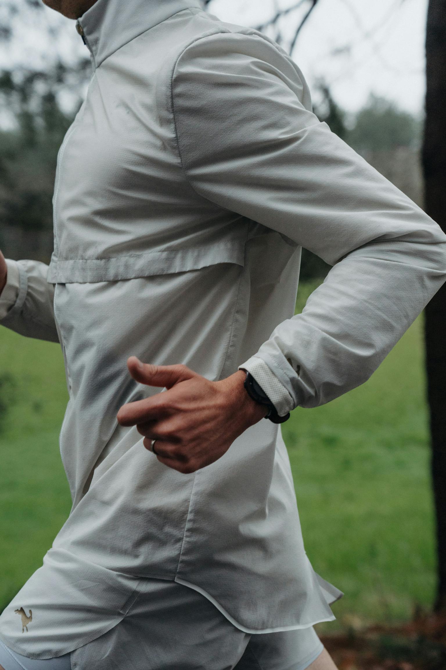 Rainy days are unprdedicatble. We designed this jacket to pack snuggly into an internal zippered pocket, which features an elastic hand strap to easily hold the packed jacket while running.