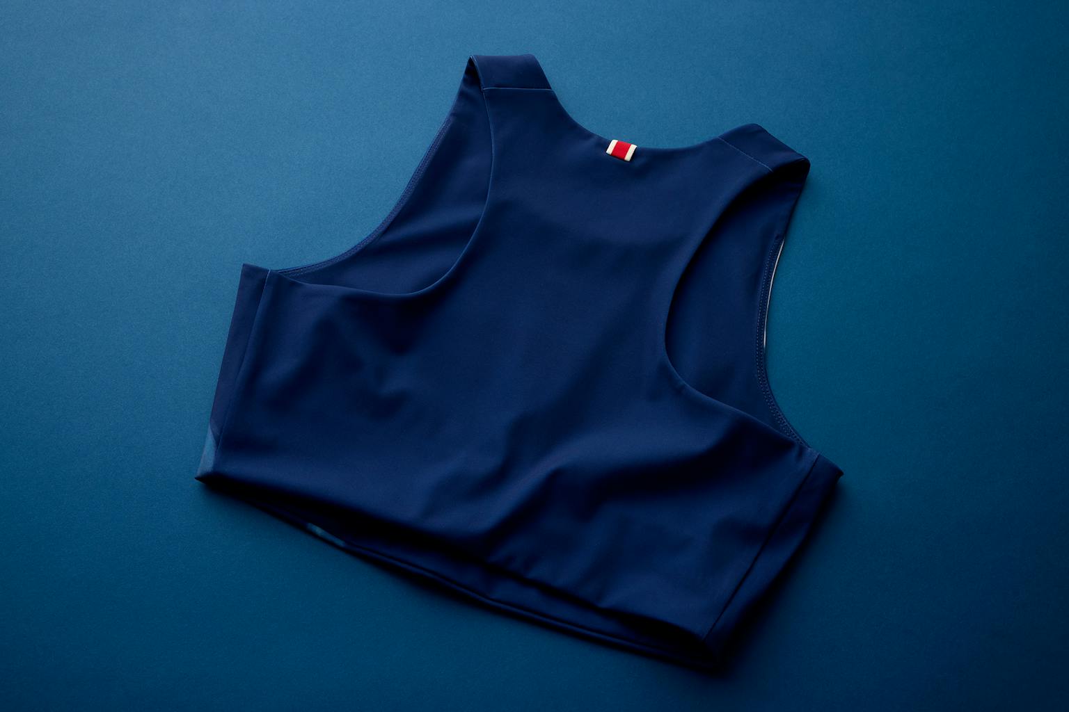 In a racerback silhouette with a modest scoop neckline, the top provides coverage at the bust, while the hemline hits above the belly button for a cropped cut. It’s a sleek style designed for speed.