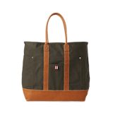 A canvas and leather tote bag made by Forestbound for Tracksmith.