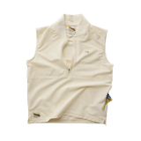 - A sleeveless, half zip silhouette with a ribbed stand collar
