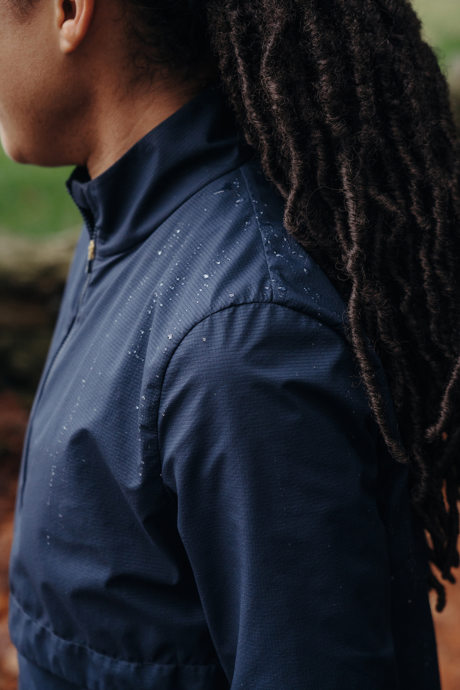 We hunted high and low for a water-repellent fabric that won't weigh you down. We found this fluorocarbon-free shell in Japan. While the fabric is incredibly fine and breathable, it sheds moisture and sends water droplets rolling off the surface.