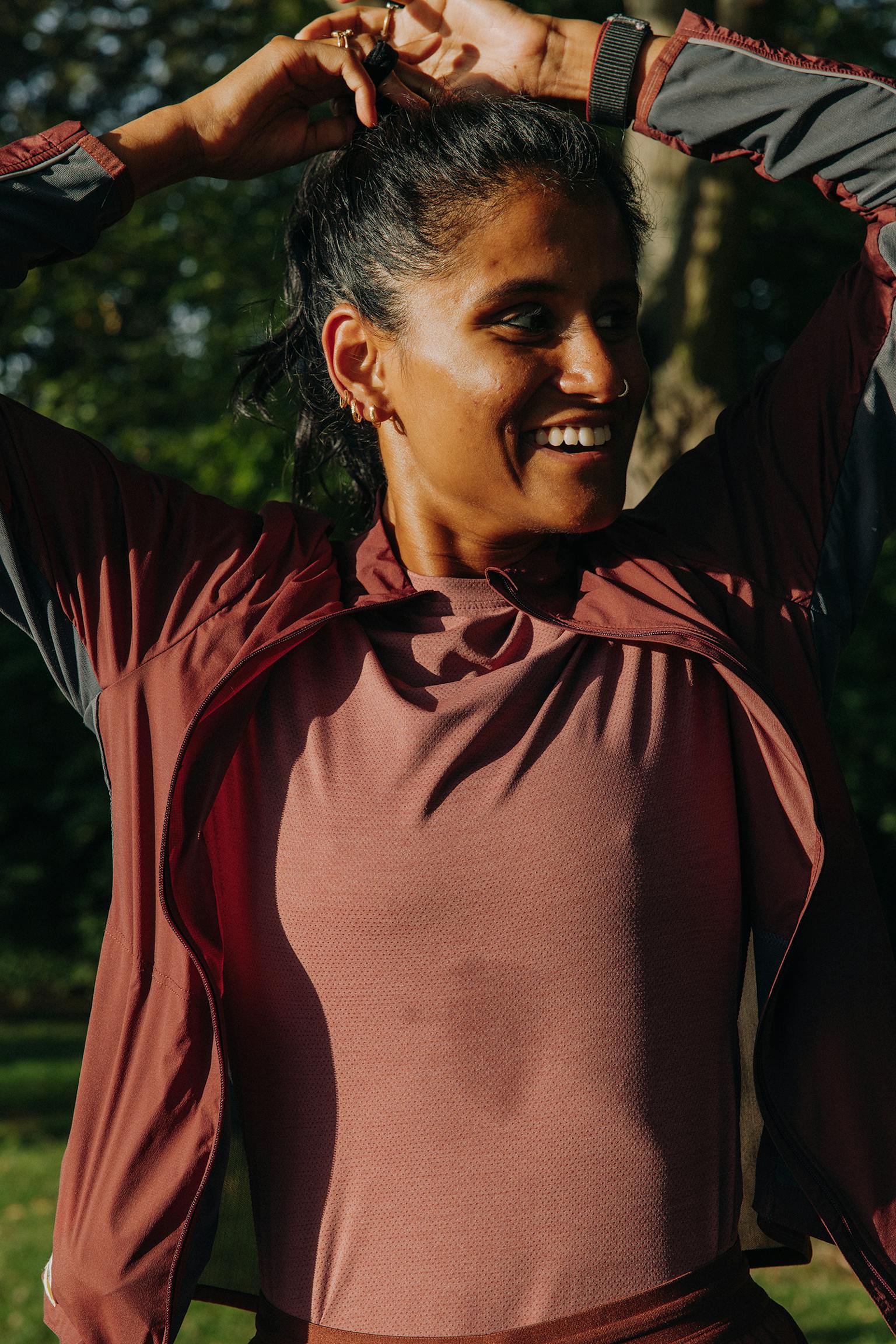 Every detail is considered, from the thousands of tiny perforations that allow for sweat and excess heat to escape, to the signature features, like the hare logo and racing stripe, that give it the touch of Tracksmith.