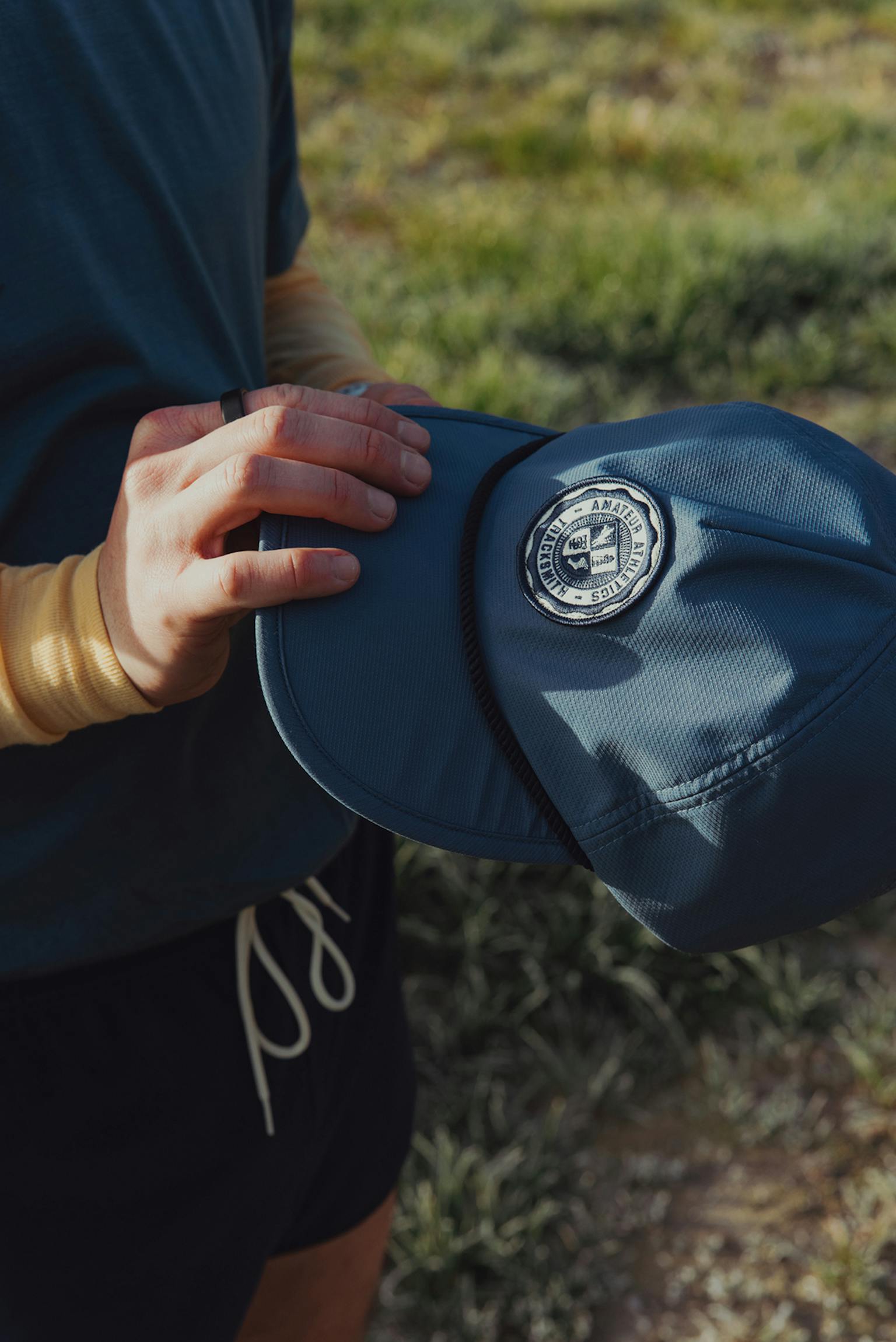 The hat is embellished with our navy Amateur Athletics crest on an embroidered patch and a subtle hare embellishment on the back, elements that speak to the runner’s spirit.