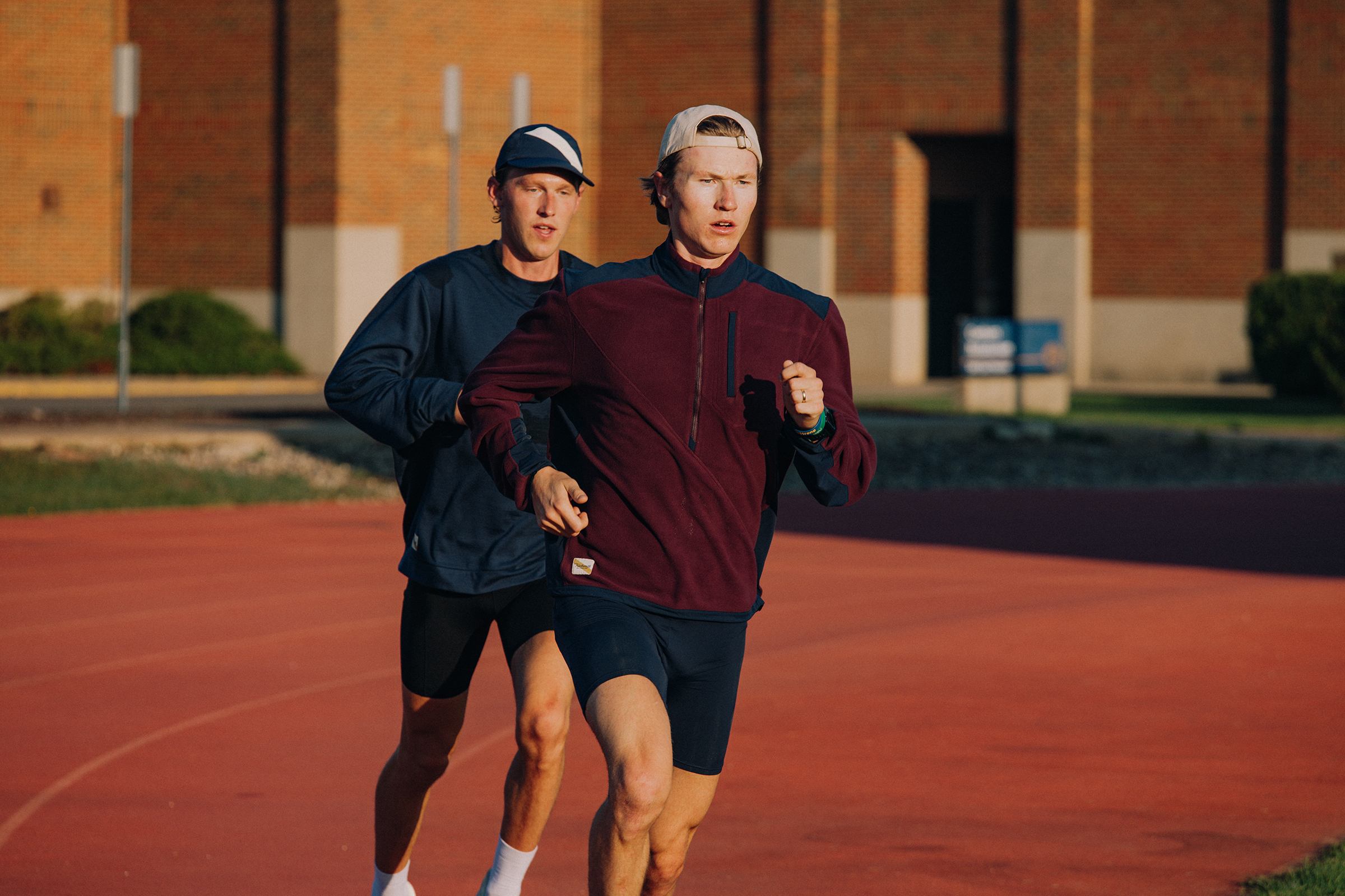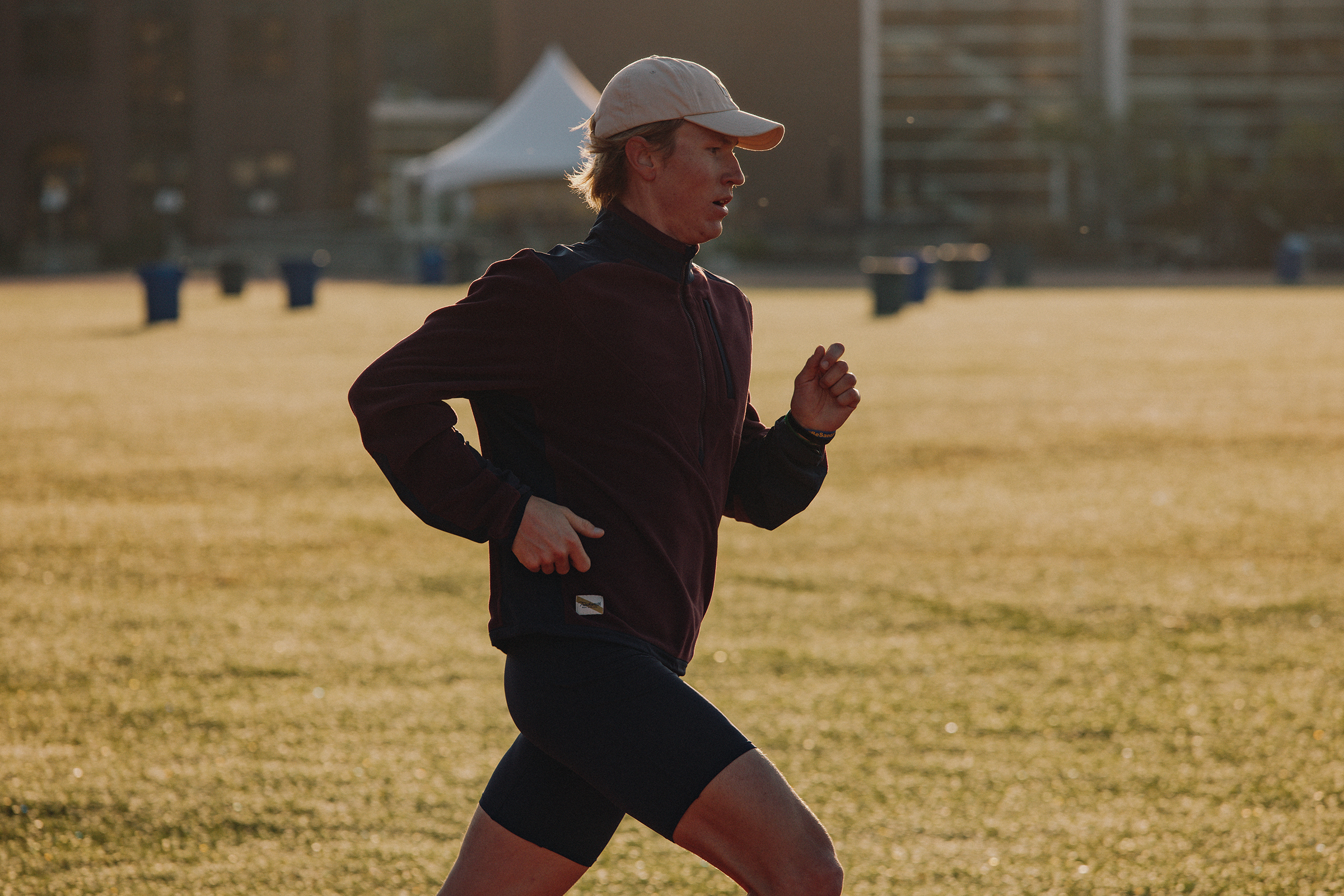 On the training plan, fast tempos. On the forecast, a drop in temperature. What better workout to try the new Franklin Fleece than The Michigan, right on its home turf in Ann Arbor. The cross-country inspired workout was conquered by Austen in the Quarter Zip style, worn with the Turnover Half Tights, Speed Crew Socks and the Eliot Racer.