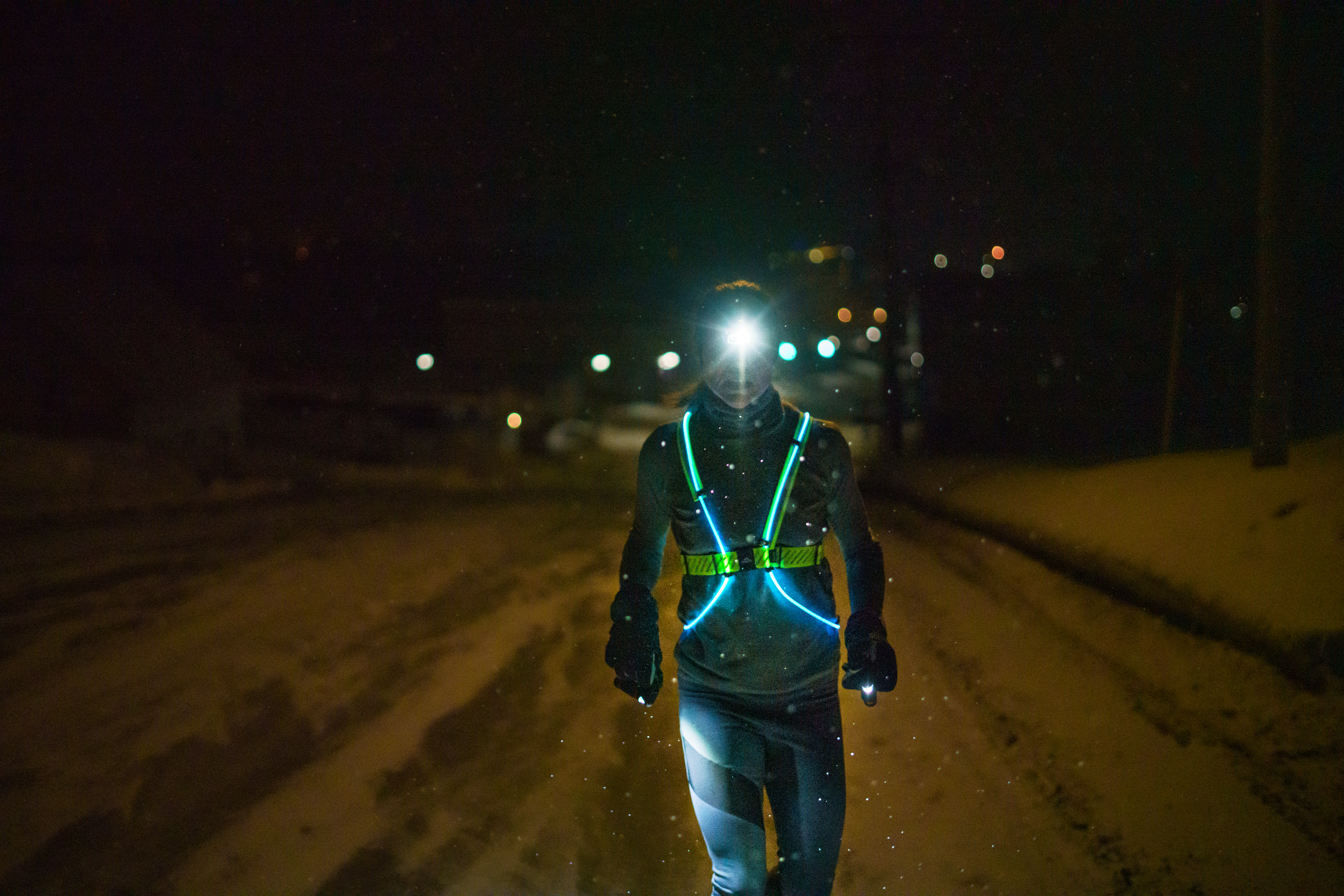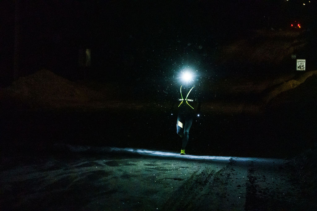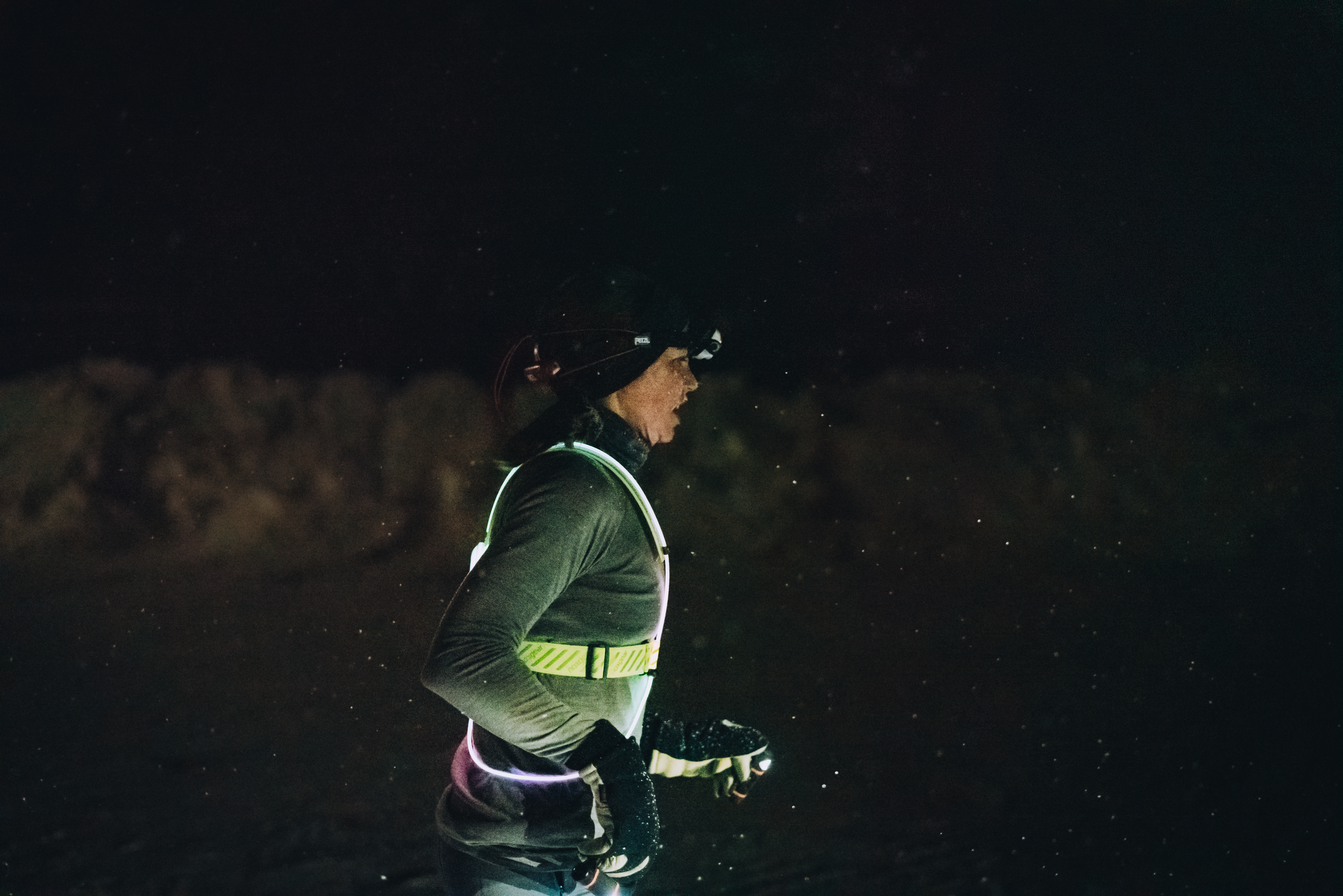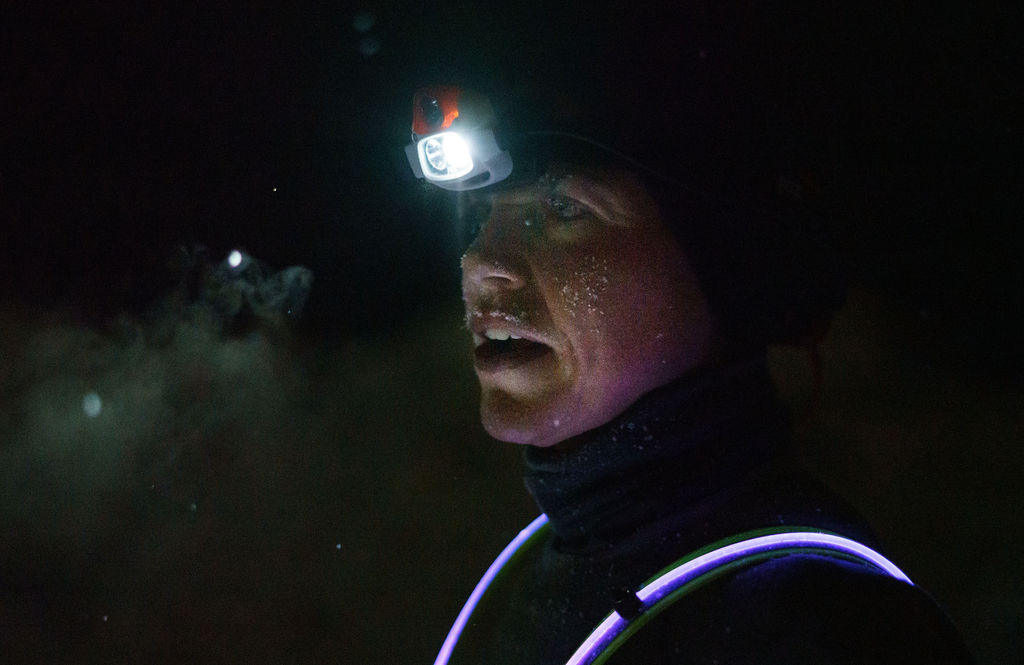 This is where Sarah Mulcahy tends to start her first mile. At 3 a.m, she begins her run dimly lit by a headlamp. With globs of Vaseline on exposed areas of her face (including eyelashes and eyebrows), Mulcahy uses petroleum jelly like it’s an invisible morph suit to keep herself from freezing. The oil serves as a barrier to prevent frostbite. She wears a few pairs of tights too, and steel studs beneath her sneakers. Gripping the elements, Mulcahy clicks off her second, third and fourth miles along the longest north-south road in the United States (ending 2,369 miles later in Key West, Florida)... until she meets her daily mileage requirement.